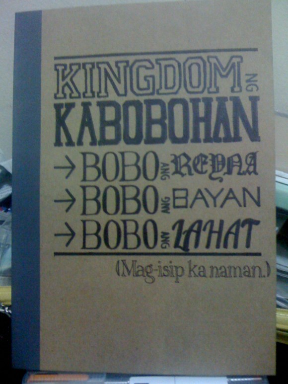 I’ve been giving the notebooks away as “Happy Day! (No Occasion)” gifts (see my first art post, which was also a non-birthday gift) , though the Chum Book is for a group of people, not an individual. It’s not a short story. Also the superhero-designed notebook was kind of a birthday gift, but it was given a day late so I maintain it’s not. The designs come from inside-joke type of things (relatable only to us) that arose from our classes/other activities. The fonts are based from free fonts I downloaded, but obviously with modifications, since I had to improvise to account for personality, space restrictions and very human mistakes. Please comment if you’d like to know which fonts I based from for a specific notebook; unfortunately I didn’t save my pegs because I’m stupid like that. It would take some time to scroll through my font book; rest assured I don’t take credit for any of them.