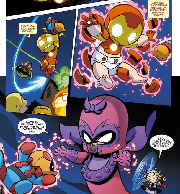 Marvel’s newest one-shot (not to be confused or associated with the more adult AvX event) is set in Marvelous Meadows, and it features a stand-off between all our favorite characters. I don’t even care about the story, or the technical details (though on both ends this comic definitely gets a golden star). It’s just. The cuteness. :O Baby Logan’s teeny butt! Scott’s nefariousness! Avengers Assemble (but only if you’re allowed)! Huhu. I didn’t see Charles Xavier, though, and I’m not sure what Pietro was doing with Wanda so vulnerable.