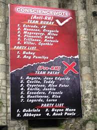 The tarp reads: Conscience Vote. (Anti-RH) Team Buhay: Estrada, Honasan, Magsaysay, Pimentel, Trillanes, Villar. Party List: Buhay, Ang Pamilya. (Pro-RH) Team Patay: Angara, Casino, Cayetano, Enrile, Escudero, Hontiveros, Legarda). Party List: Gabriela, Akbayan, Bayan Muna, Anak Pawis.