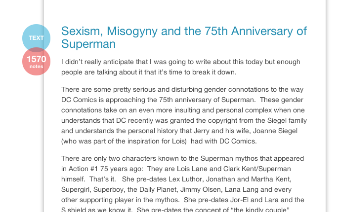 Sexism, Misogyny and the 75th Anniversary of Superman is one of those moving and well-written articles that can be unexpectedly found in the mixed maze that is tumblr. It tackles the issue of who appears in the variant cover of the issue celebrating Supes’ 75th. Here, Lois Lane –who I never had love for, because (1) I wasn’t a DC fan and (2) I wasn’t a DC fan– is painted as the cornerstone of female characters and empowerment in the comics universe. She’s tough, hard to objectify, a career woman, and, most importantly, one of the only two presently known characters to have appeared in Action #1, the very first issue (the other being, of course, Superman). Because of her, career women like Pepper Potts (who is a MCU favorite of mine) exist. Because of her, we have Superman as we know him.
