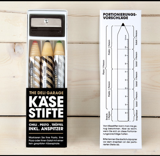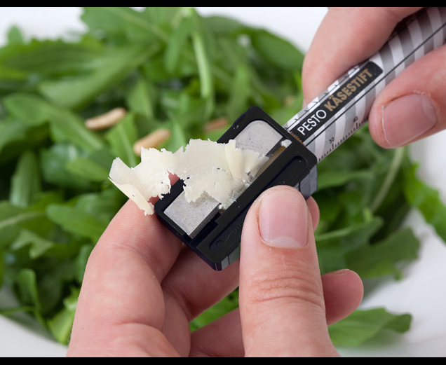 are shaped like oversized pencils, where the “leads” contain three different flavours: truffles, pesto and chilli. With the built-in grating function you can sprinkle delicious, appetizing flakes of parmesan cheese on your meal. A scale lists how many calories the portion contains.