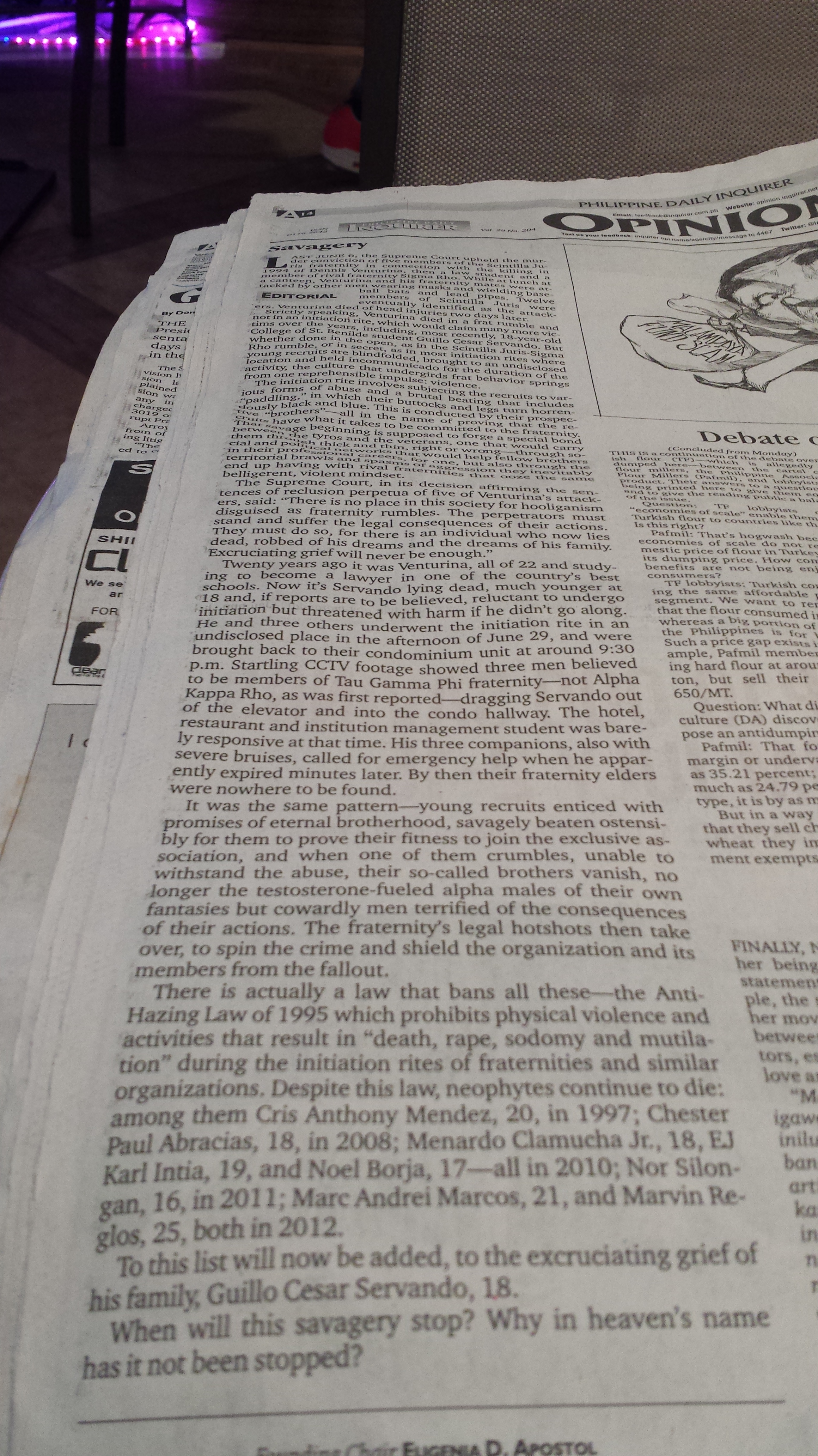 Fraternity and sorority members here in the Philippines would like to defend themselves and their organizations from the darkness cast by Servando’s recent death (and following crackdown on hazing frats). It’s either a defense by exclusion (our frat/soro doesn’t initiate members by hazing!) or by justification (it’s an accepted tradition!). They would go on to extol the virtues of being a member of a fraternity or sorority, how much it aids in quality of life in college and beyond, et cetera. The presence of high-profile frat and soro members in law enforcement, public office and media does not hurt their arguments either.