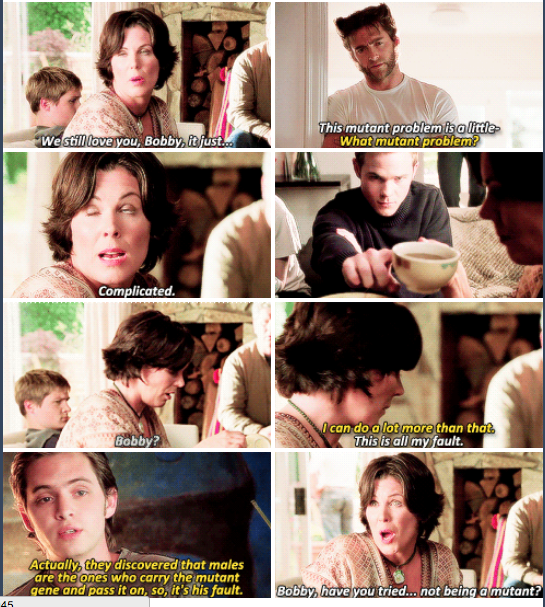 Until I read an in-universe thesis on mutant genetics, specifically a section on the mode of inheritance of the X gene, I cannot accept the “Actually, they discovered blah blah” science! quoted by Pyro over there. I mean, in what universe would it be evolutionarily advantageous to have the X gene Y-linked?