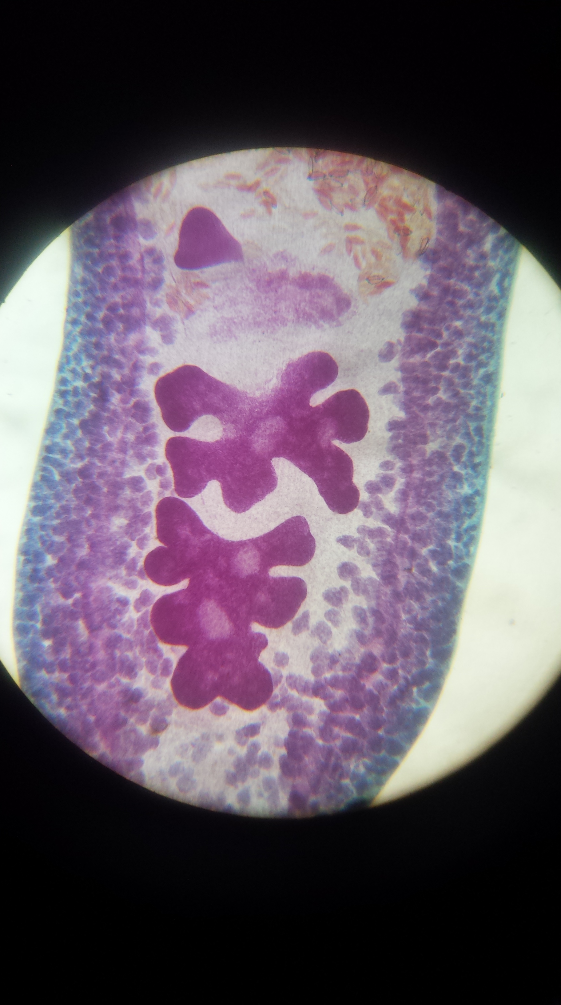 features a stained whole mount of Echinostoma malayanum viewed under a light microscope.