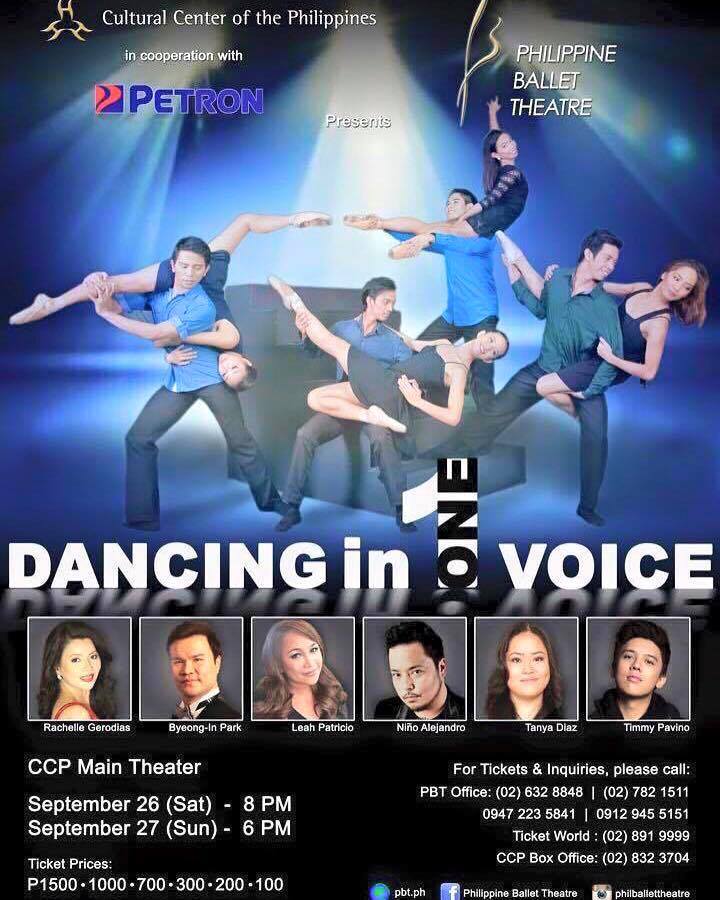 The Cultural Center of the Philippines in cooperation with PETRON presents Philippine Ballet Theater in ‘DANCING IN ONE VOICE‘, sound in motion for the Arts & Education, a dance benefit concert featuring guest artists opera singers Rachelle Gerodias and Byeong-in Park, and the Voice Season 2 finalists Lea Patricio, Tanya Diaz, Niño Alejandro and Timmy Pavino. Visit www.pbt.ph or TicketWorld.