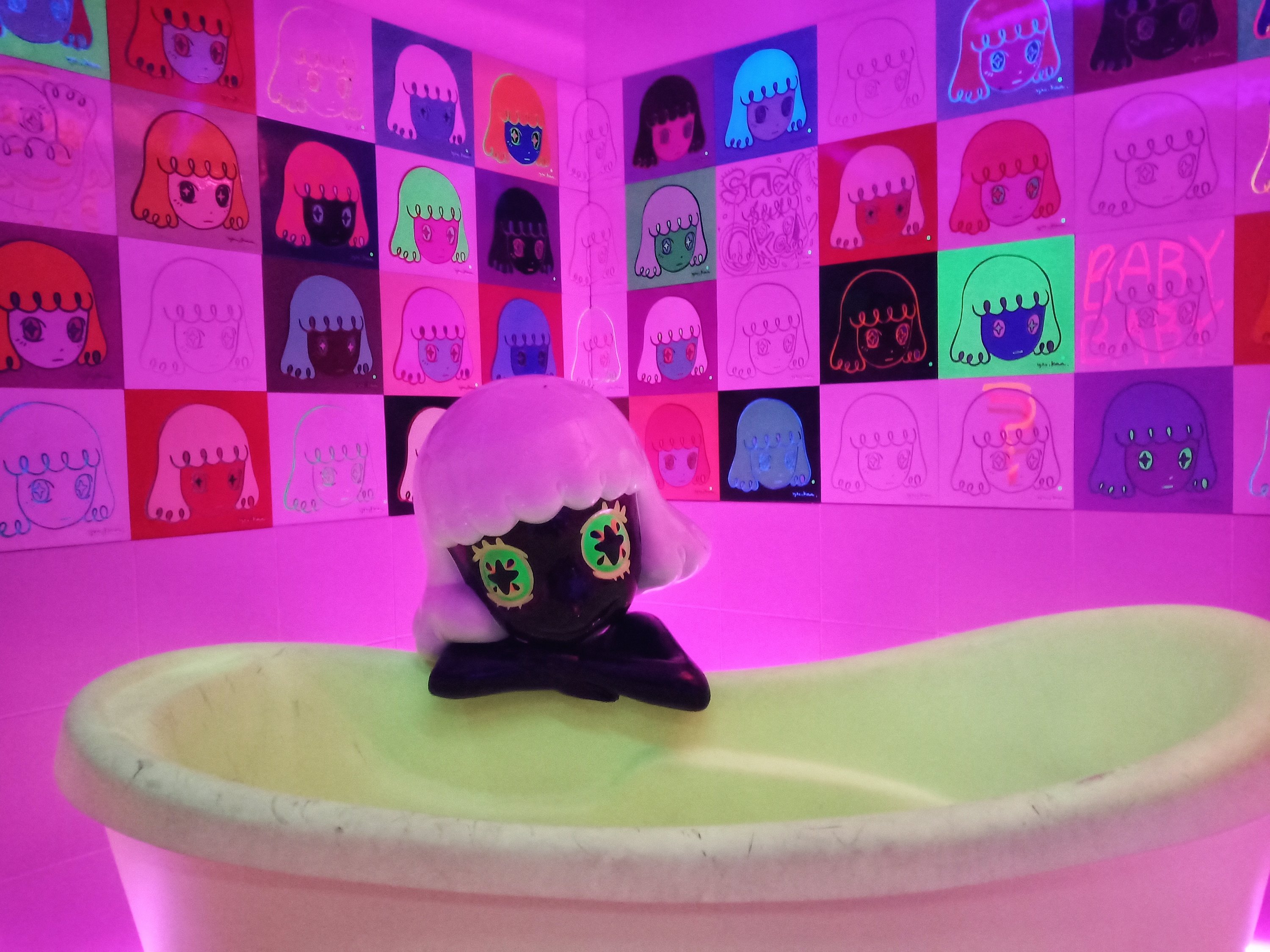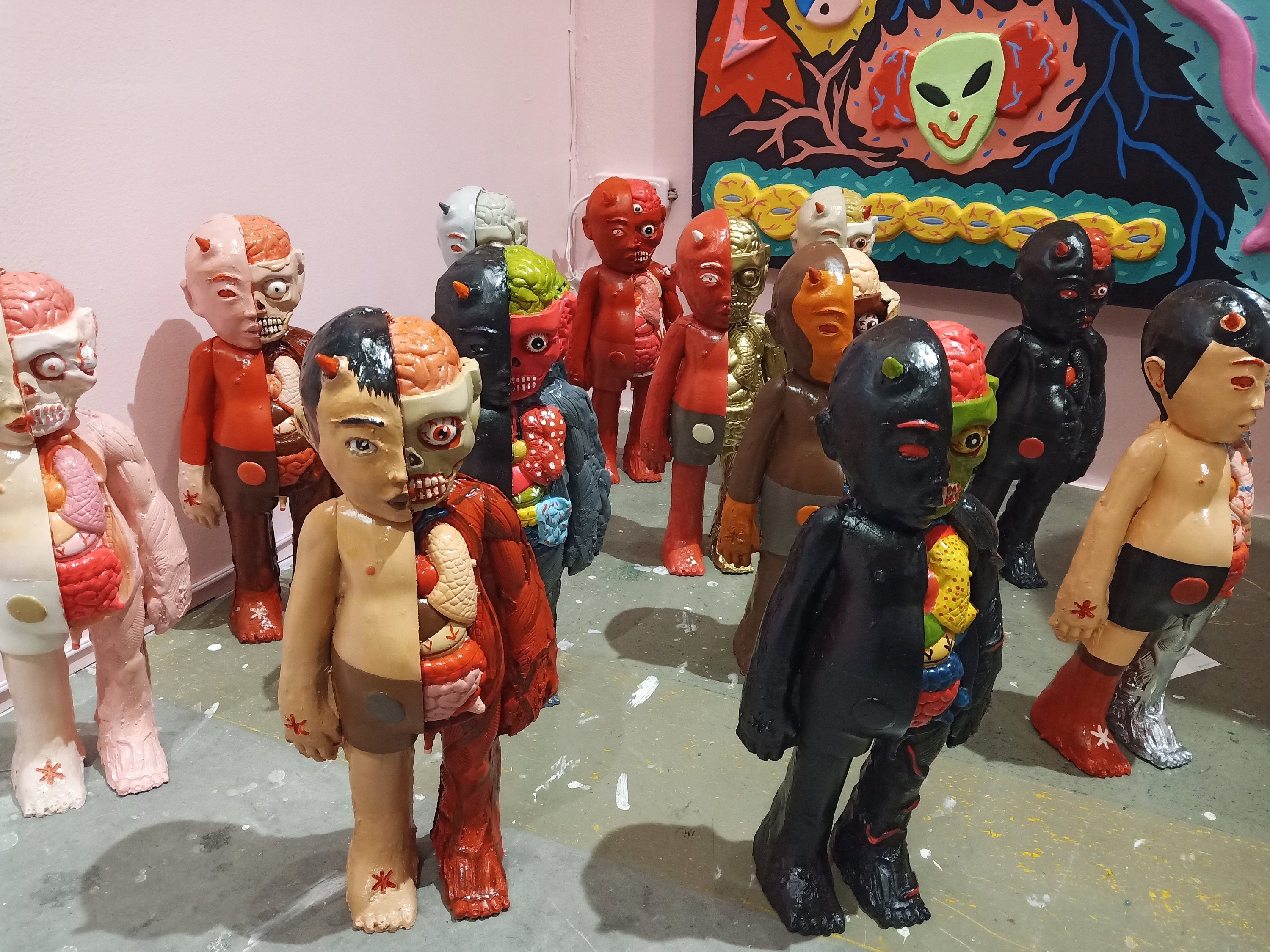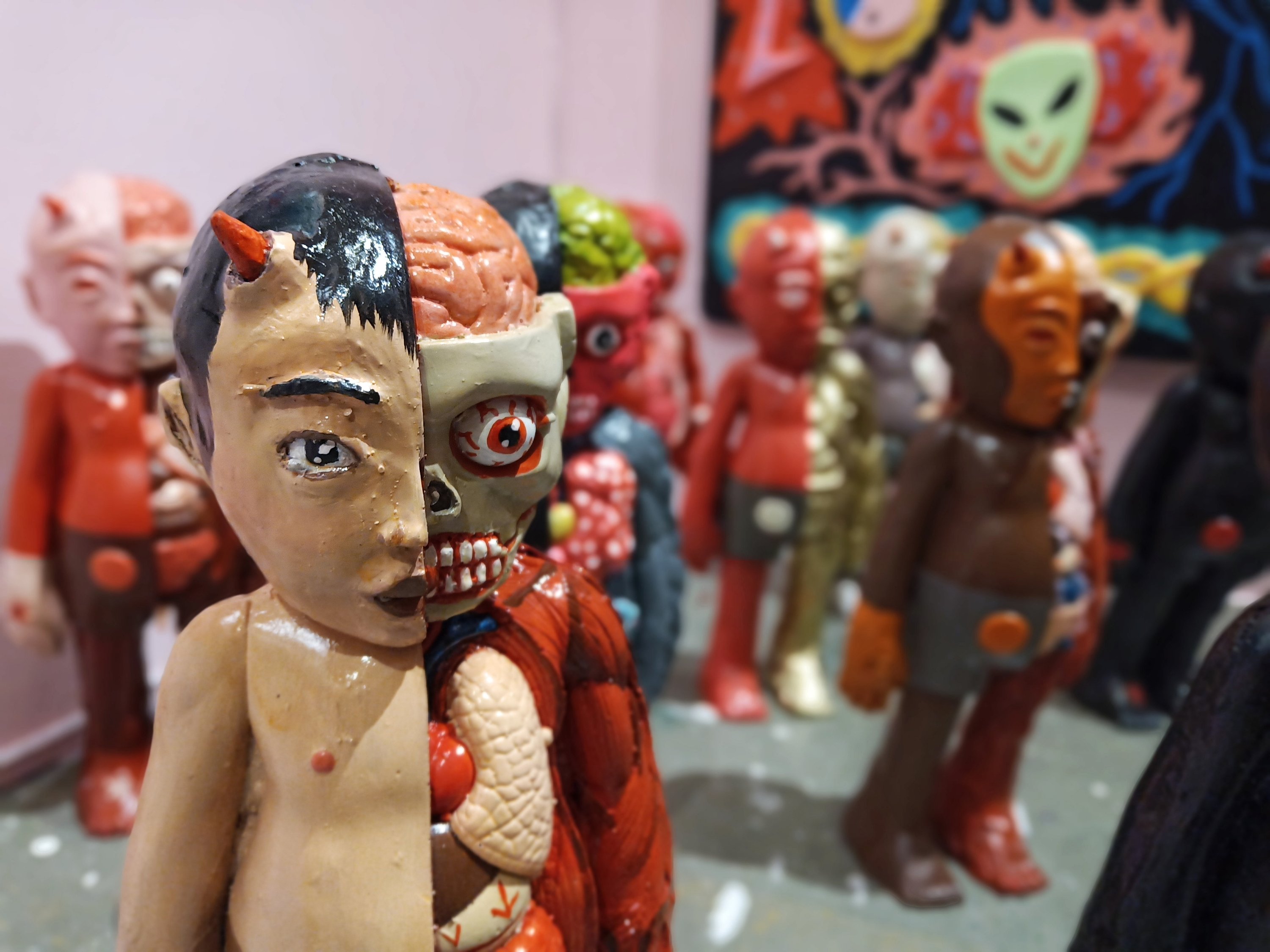 The playful reference to KAWS (real name: Brian Donnelly) was the first thing that caught my eye. I’ve been fascinated by his sculptures lately because they tend to sell for unimaginably high prices. It’s become a brand. The second reason why I loved FLAWS is because of its commentary, as the name suggests. Little demonic sculptures with colorful viscera underneath.