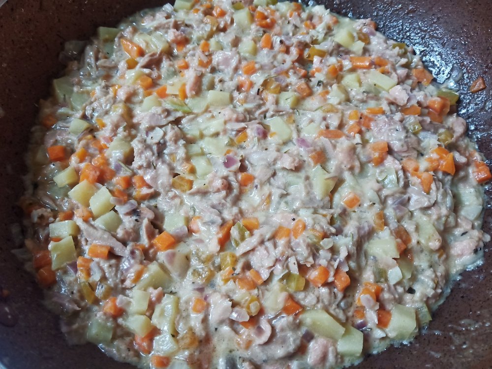 - Stir and cook for a few minutes until milk is reduced. The tuna filling should have an almost paste-like consistency. This makes it easy to put in the dough later.