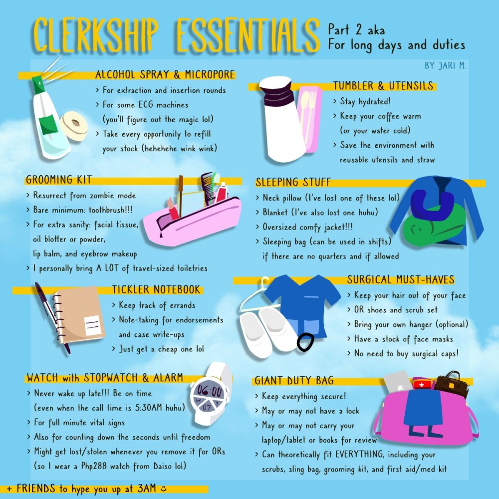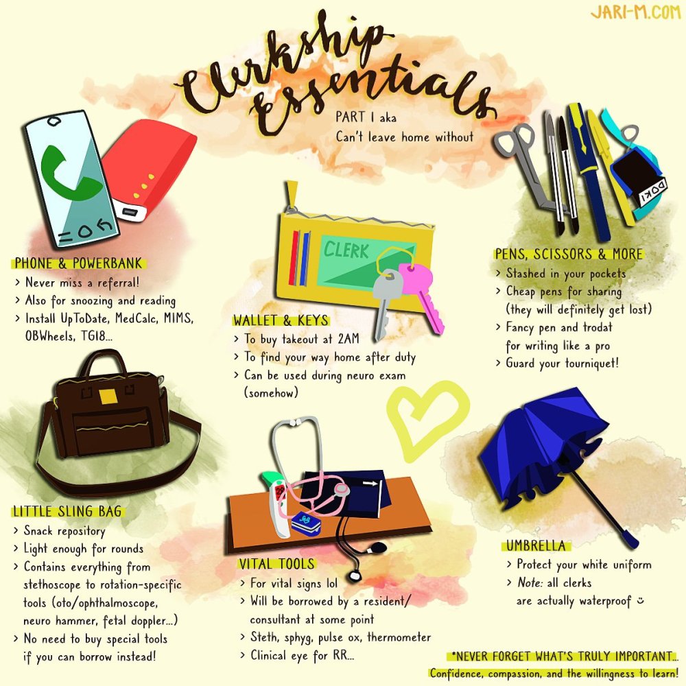 Over the last few days of online clerkship, I spent some time procrastinating making “clerkship essentials”, a couple of graphic guides on the material must-haves of any well-equipped clerk.