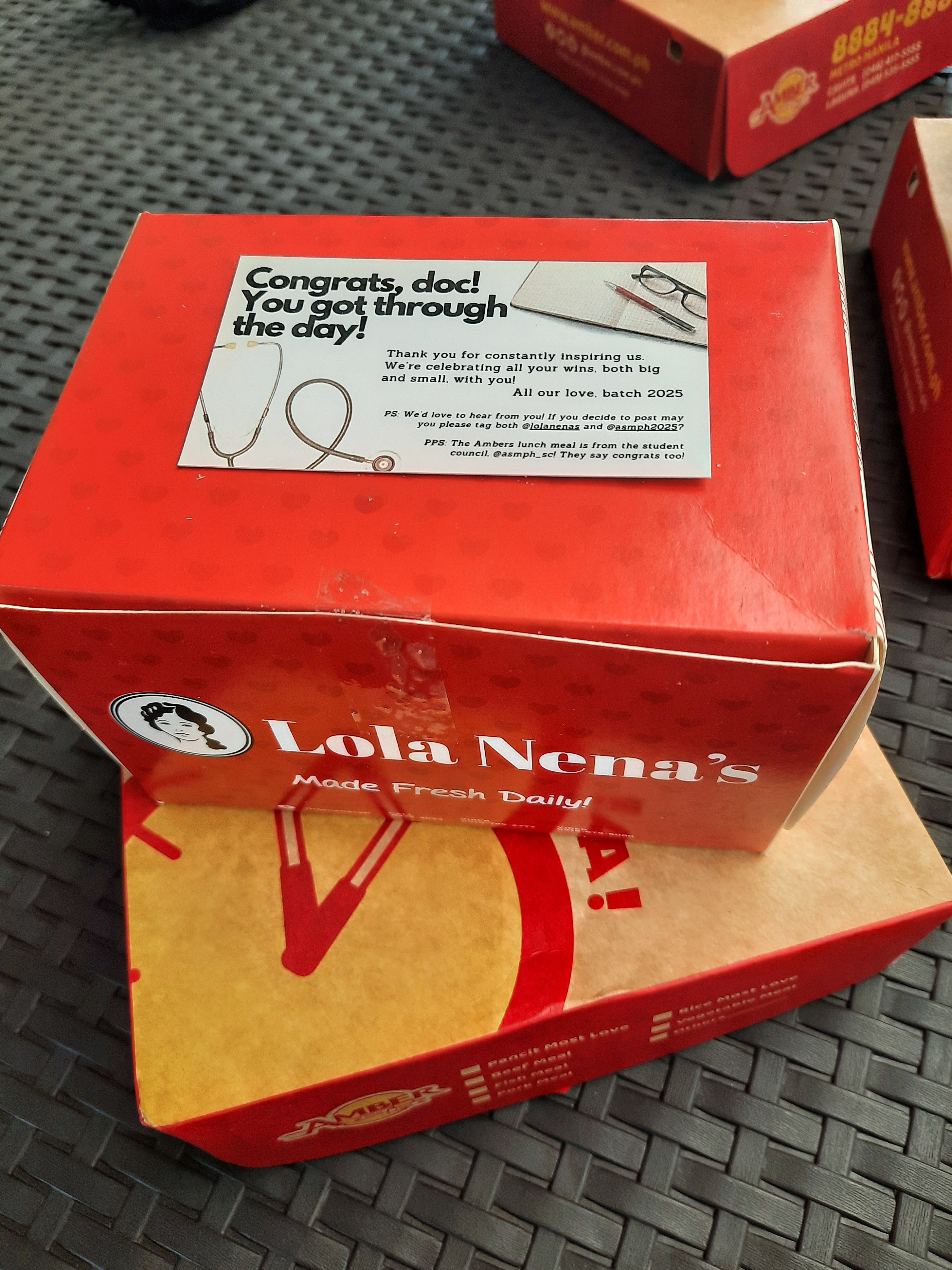 Visiting room. We only had one full day rotating in the Psychiatry department –our schedule was super tight because another cluster was taking minors the same time as us. This was my duty team (subcluster 3A represent etc, featuring Shaira, Justin, Ilou, Raph) for that singular duty. I considered psychiatry as a specialty, but that was before I realized how much I needed sunlight and mobility (basement wards are not my thing). And I only have a tablespoon of emotional intelligence. This was also the first day of ARCUS AIR, which was a mess. The less said about it, the better. .Highlights of radiology include Doc Reza just doing her own social rounds, the non-stop patient interaction in the interview room post, and the fun teaching vibes from all the residents I shadowed. Also, I was super lucky to have gotten the AM post for all three days of our rotation, so I was always home before 12NN! I proceeded to squander that time by napping as if I was compensating for something. .Last floors duty. It was our first (and turns out, not last) day rotating in ENT, and I told JD ‘let’s get a photo’ just in case. That was one of the most benign but also instructive floor duties I’ve had this month (thanks to Doc Raph and also to the hit-or-miss features of Arcus Air). Rule out ENT or any surgical field, but the exposure was still great! .Missing breakfast. I can’t count the number of times I’ve had this combo for breakfast over the last (cumulative) 12 months of clerkship-internship. This is the classic Starbucks ham-and-cheese croissant plus the iced latte from the vending machine. Ahhh, I’m already missing this set, and I haven’t even left. Maybe I’ll make the effort to experience this one more time in the TMC gardens… . One Big Family. With boards just around the corner, other batches (from 2016 to 2022 and beyond) have been dropping gifts in support. Thank you so much to this community! Finding milk tea or candy or even funny bookmarks in the quarters was always a delight. .