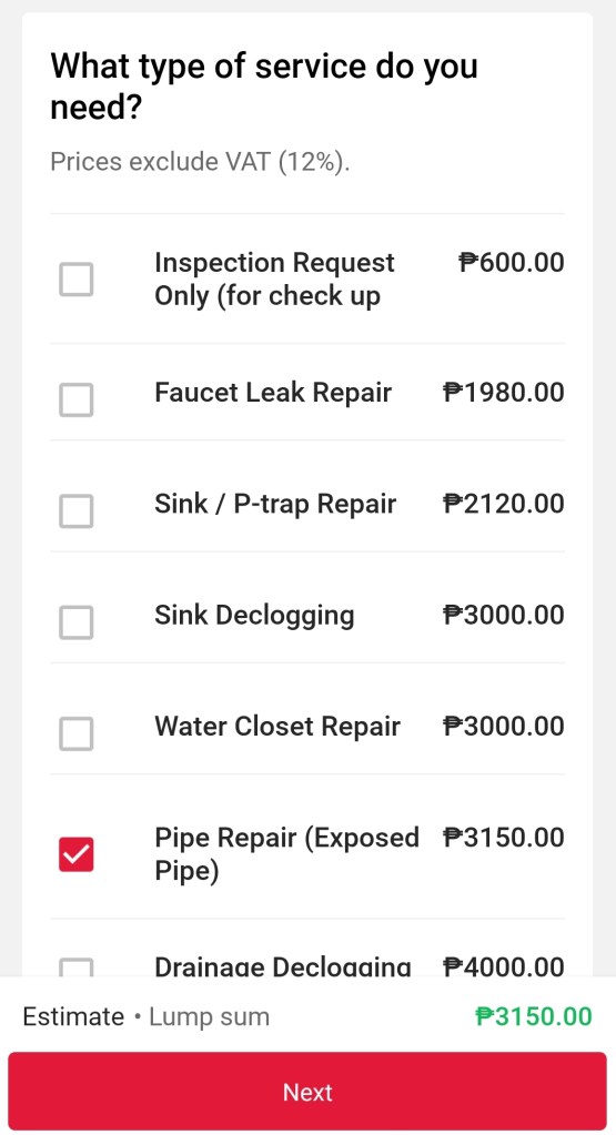 - Type of service. The app provided a list of possible services under a category. For plumbing repair, the options (and price quotations) range from inspection request to pipe line declogging (a whopping PHP6000).