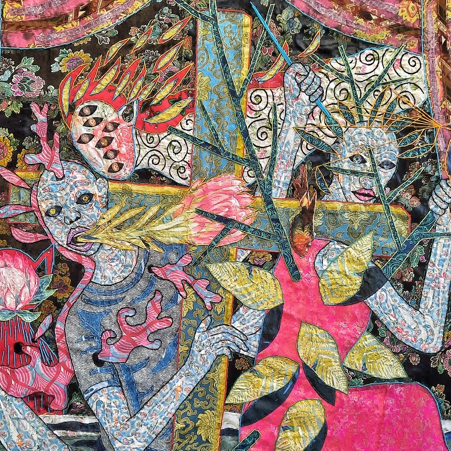 I was too distracted by the colorful interplay of cut fabrics and threads to consider the work’s meaning. In hindsight, though, the texture of the piece reflects the patchwork complexity of the lives we live, and the efforts we make to create meaningful narratives. My rumination on color and texture aligned itself with the artist’s intention in the end.