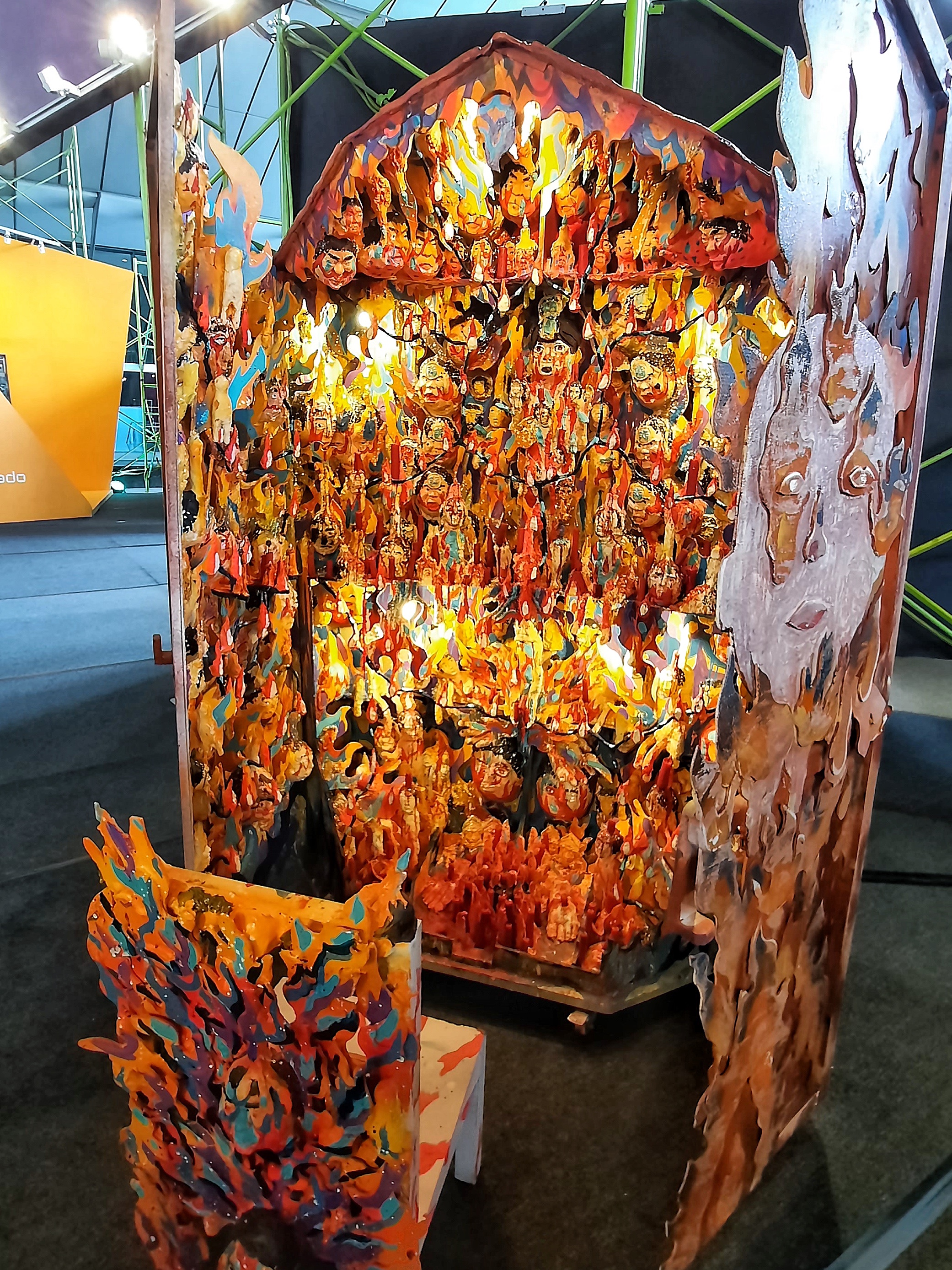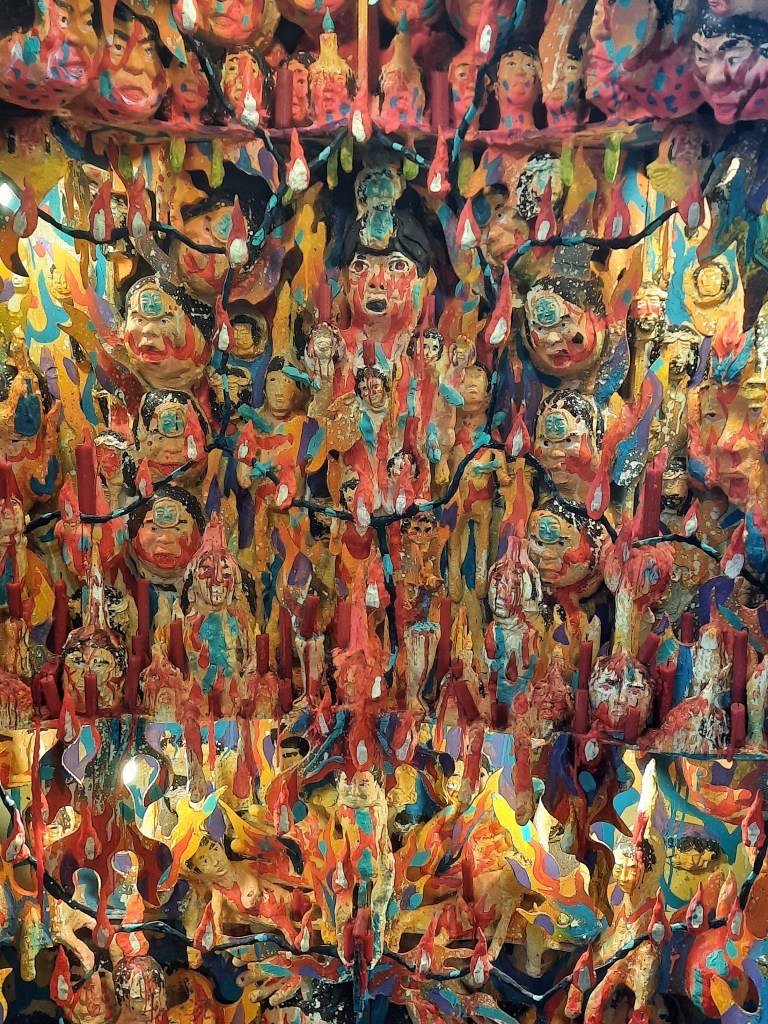 Several personal altar-like pieces comprise the first collection that meets the eye upon entering ArtFairPH/Projects. The religious imagery –in this particular one, the fiery suggestion of hell, the burning of candles, and the central arrangement echoing a rosary– caught my eye.