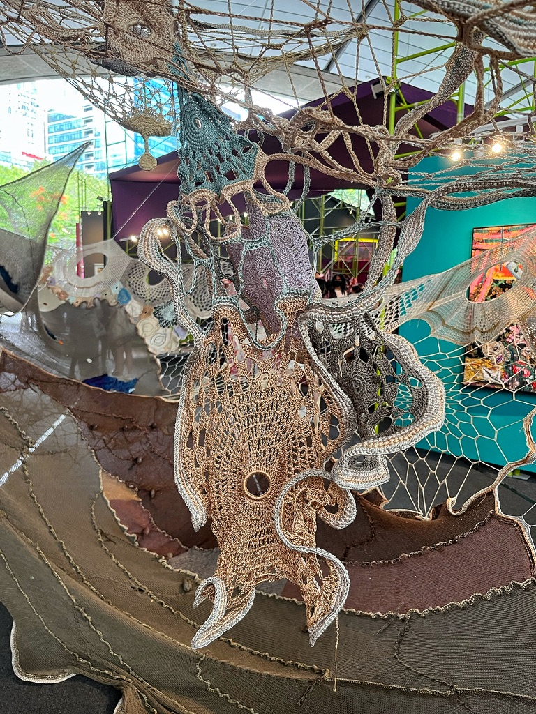 At around 40 x 12 feet, this piece cannot be ignored. Made using the traditionally feminine craft of crocheting, this centerpiece highlights weaving as an art form (and as an obstacle course?).