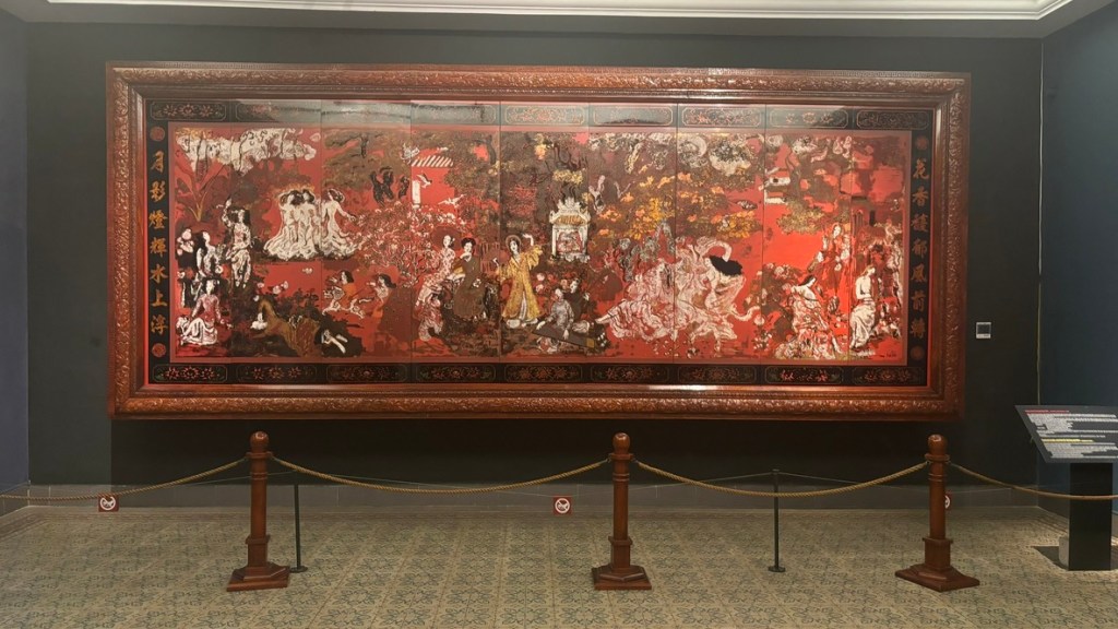 I loved many of the pieces in the museum. I’d post all of them if only I wasn’t running out of blog storage space. One of the standout pieces was this permanently exhibited “national treasure” in lacquer on wood. Entitled Central, South and North Spring Garden, artist Nguyen Gia Tri depicts women from different parts of Vietnam coming together for a festival. The side panels read out some poetry: