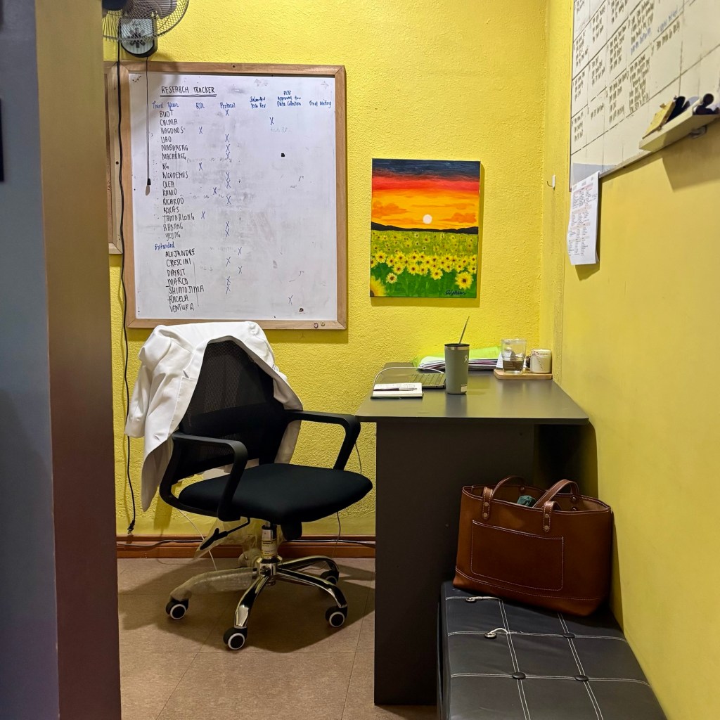 The office setup: I inherited this cubicle from Ma’am Airam, who served as Chief Resident for Training and Research for two years in a row. Whiteboard of research progress at the back (which has progressed a tiny bit more by now), some candles on the table along with my coffee mug. We let go of updating the whiteboard with the monthly calendar on the right; it remains empty for now. Painting of the sun setting on a sunflower field by Dr. Alphius, the outgoing Chief Resident when I was a pre-resident whom I truly admire (I love when things go full circle). The gorgeous custom leather bag my mom gave me for my last birthday, from MarkedHQ —catch his art on Instagram. The less said about the rat(s), the better.