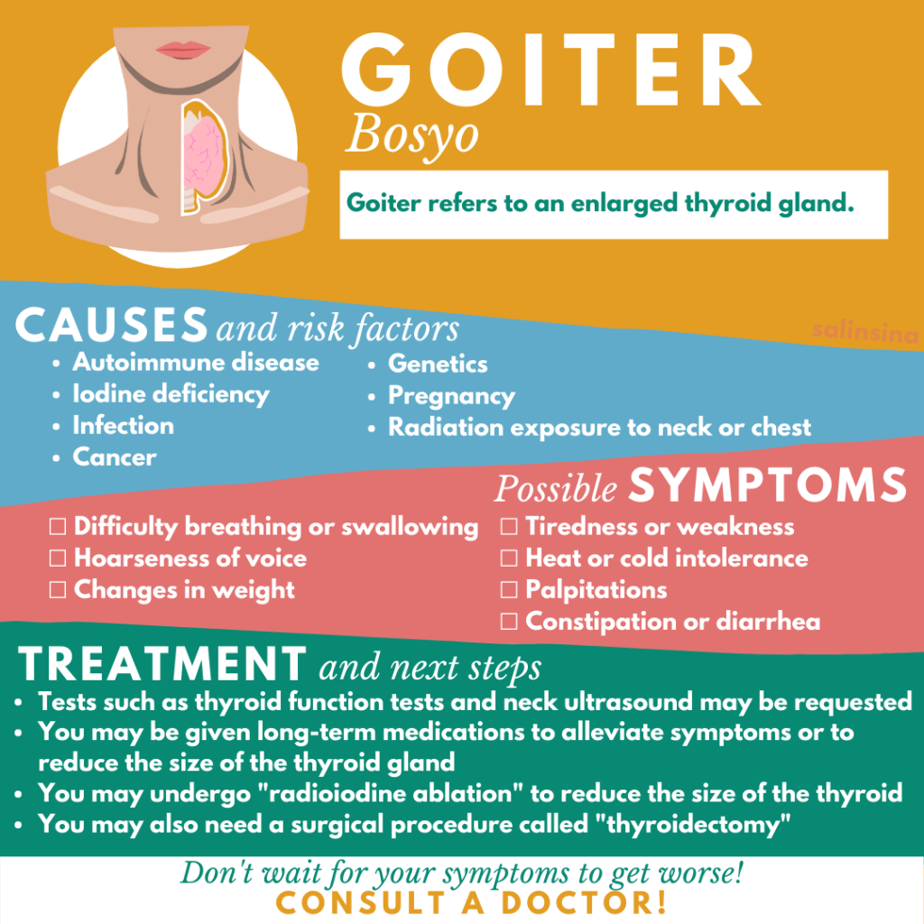 😷 Ang goiter, o bosyo, ay ang pagkakaroon ng bukol sa leeg dahil sa paglaki ng thyroid gland.